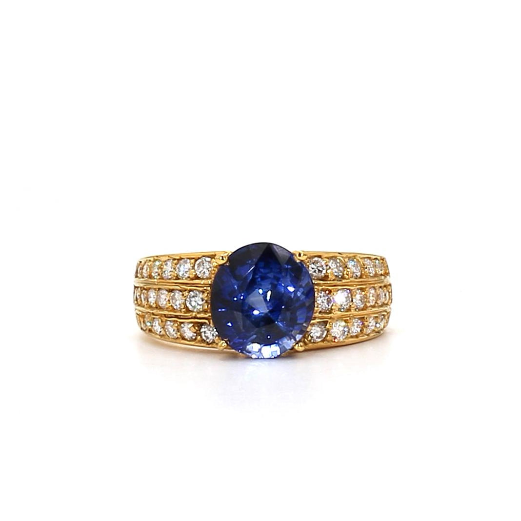 RING23-Wide Band Blue Sapphire and Triple-Row Diamond Ring in Yellow Gold